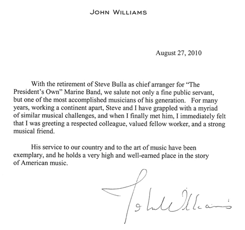 In 1980 he won an audition for the position of Staff Arranger to "The President's Own" United States Marine Band and Chamber Orchestra in Washington DC. For the next thirty years he would provide musical scores for myriad White House events, beginning with the Reagan era until 2010.